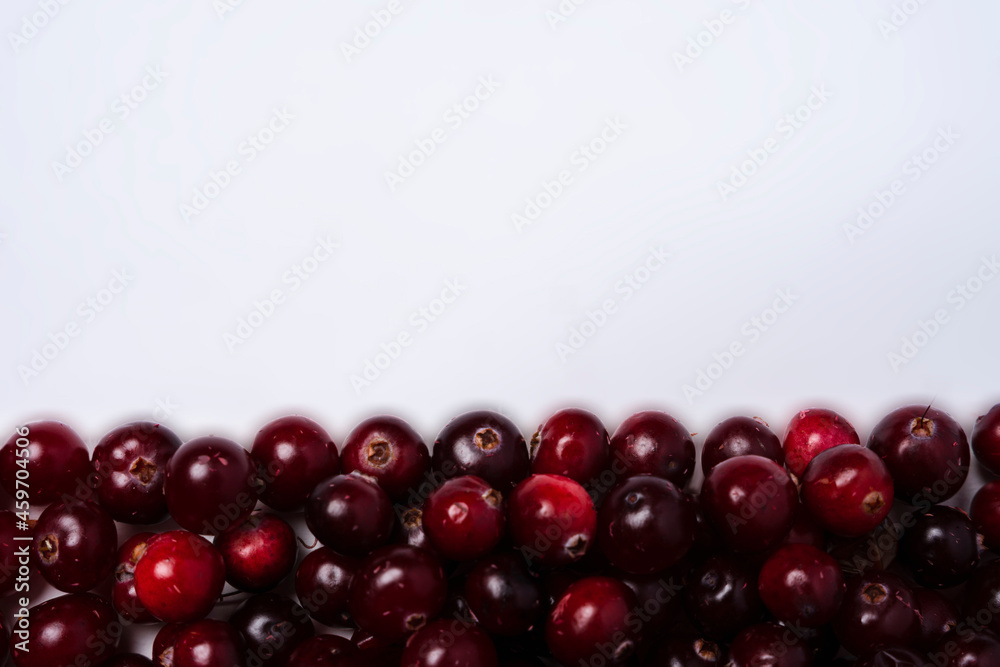 Background of ripe red cranberry berries and white space for copying, top view of cranberry berries