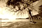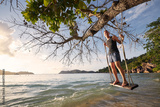 Beautiful sunny day on beach. Happy man on swing enjoying holiday in Seychelles..