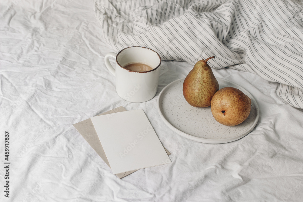 Autumn, summer breakfast in bed composition. Cup of coffee, blank greeting card mockup and pear fruit on ceramic plate. White striped linen bedding. Feminine lifestyle composition. Interior.