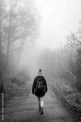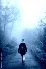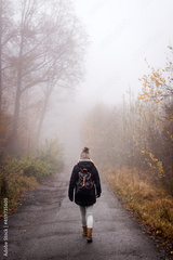 Woman walking on country road in fog at autumn morning. Tourist hiking in forest. Adventure and active lifestyle in nature