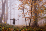 Tourist enjoying positive energy in autumn forest. Woman is feeling good in woodland. Connection with nature. Foggy weather at fall season