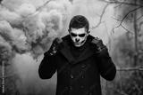 The image of a skeleton on Halloween in the park. The Image of a man on halloween. A man in the image of Dracula in a black coat. Clouds of orange smoke in the background. White makeup