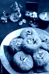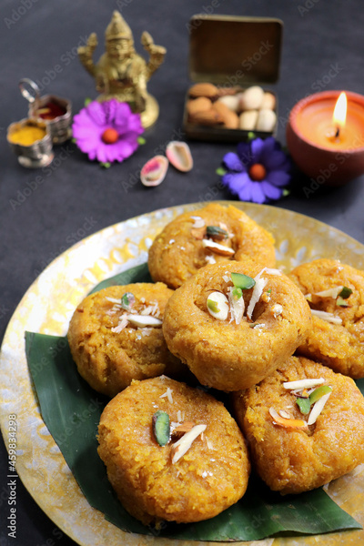 Indian traditional sweet balushahi served on a metal plate over black background. Also known as Balsaahi, badushah is a sweet food served on a Brass plate over moody background. Copy space.