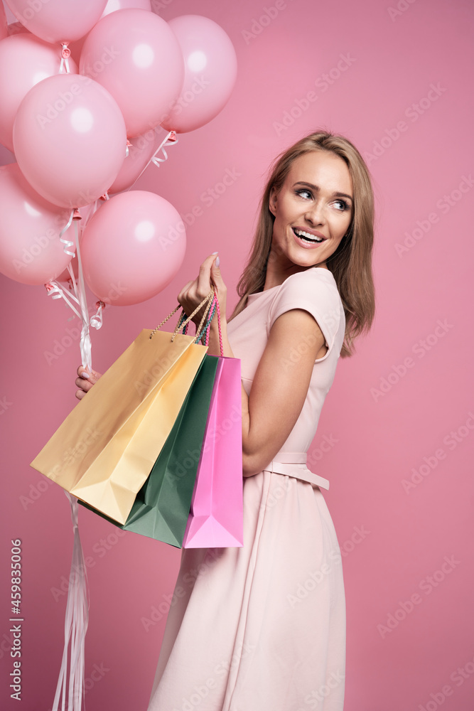 Vertical studio shot of caucasian young woman with shopping bags and pink balloons