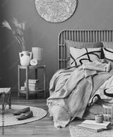 Wooden bed in stylish neutral bedroom interior with design furniture, decoration, carpet, book, dried flowers in vase, bed sheets, blanket, pillows and elegant personal accessories in home decor.