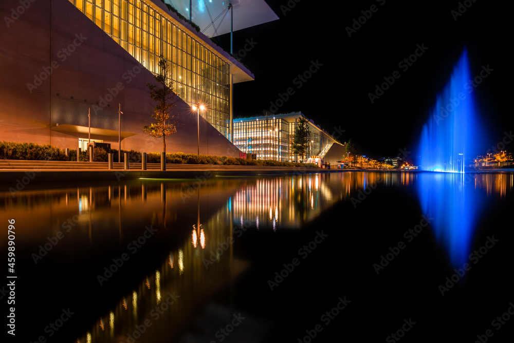 Stavros Niarchos Foundation Cultural Center at night. Nowadays it houses the National Library of Greece and the Greek National Opera