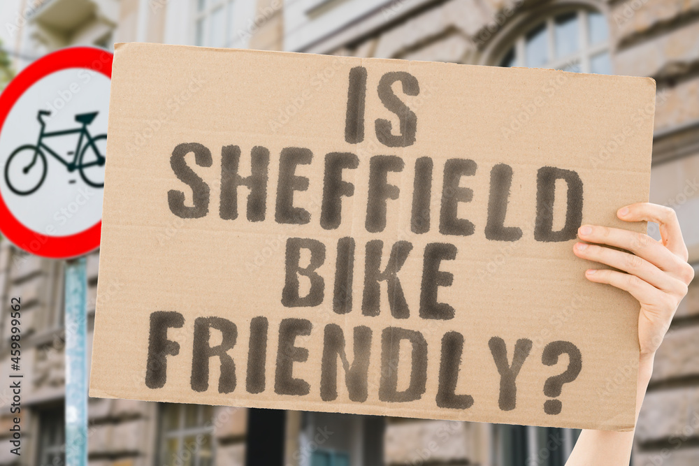 The question " Is Sheffield bike friendly? " on a banner in men's hand with blurred background. Transportation. Zero waste. Bicycle lane. Streets. City. Safety. Insecure. Road signs. Dangerous