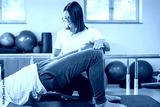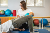 Man doing bridge and squeeze exercise, using ball. Physiotherapy exercise with the ball between the knees for the inner thighs and good leg alignment.