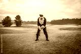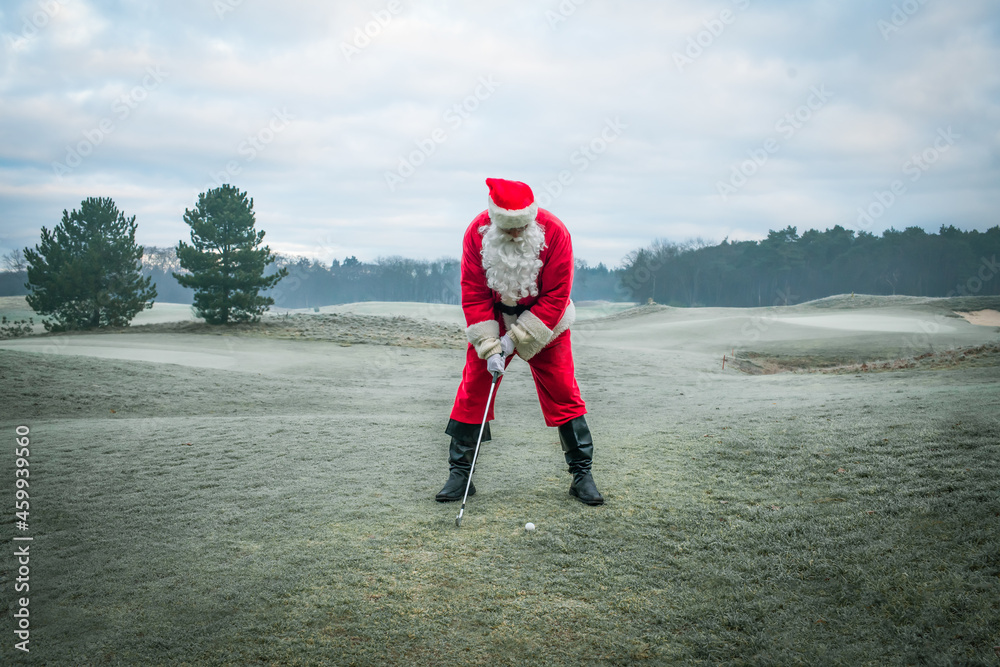 Santa Claus plays golf on a winter field during the Christmas holiday.