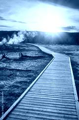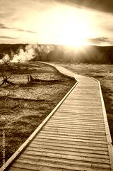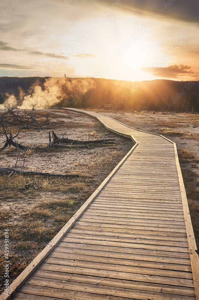 Wooden bridge trail in Yellowstone National Park at sunset, Wyoming, USA.