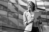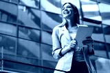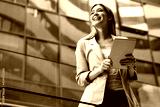 Portrait of a successful business woman using digital tablet in front of modern business building