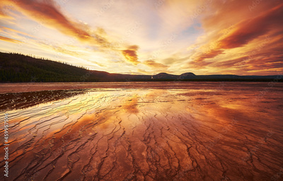 Grand Prismatic Spring at sunset, Yellowstone National Park, Wyoming, USA.