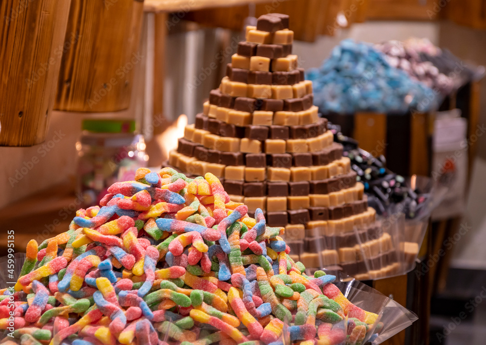 A bunch of colorful marshmallows and sweets. Concept : sweets at a children's party, extra calories, a yummy store.