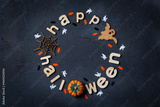 Halloween greeting card with ghosts, spiderweb, pumpkin and bats