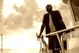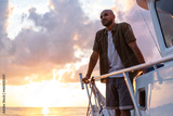 Young african american man relaxing on a sailboat in open sea at sunset