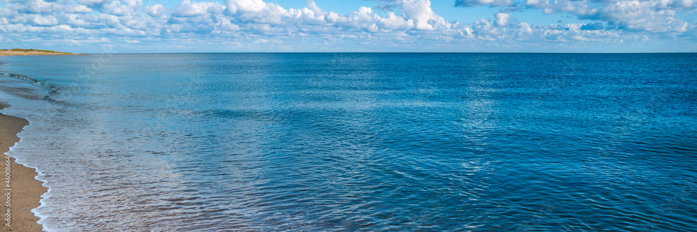 Panoramic seascape with gentle waves rolling in on the beach in the Atlantic Ocean in Massachusetts