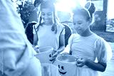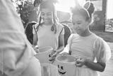 Girls hold buckets and wait for treats at halloween