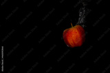 Fresh fruit fall into the cold water with air bubbles as symbol for healthy vegan lifestyle in short time exposure of high speed camera