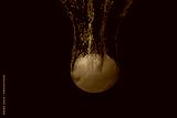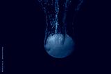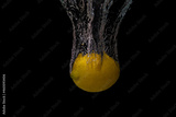 Fresh fruit fall into the cold water with air bubbles as symbol for healthy vegan lifestyle in short time exposure of high speed camera