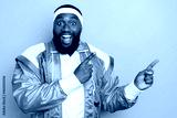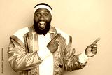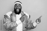 Photo of sweet excited dark skin man wear blue suit headband pointing fingers empty space smiling isolated yellow color background