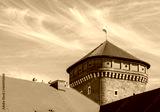 biało czerwona flaga polska zawieszona na starej wieży na Wawelu w Krakowie