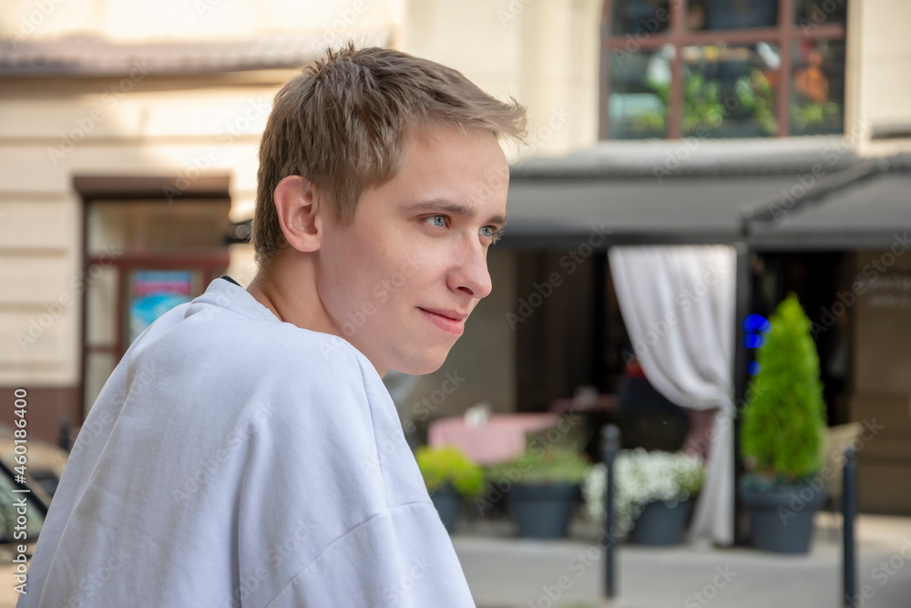 Street portrait of a young guy 20-25 years old in a white sweater against the background of old urban architecture. Perhaps he is an IT specialist or a tourist, a student or a novice specialist.