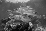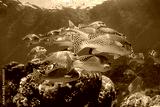 black strips and dots yellowfin Fish swimming around coral reef, photo taken underwater at the Great Barrier Reef, Cairns, Queensland Australia