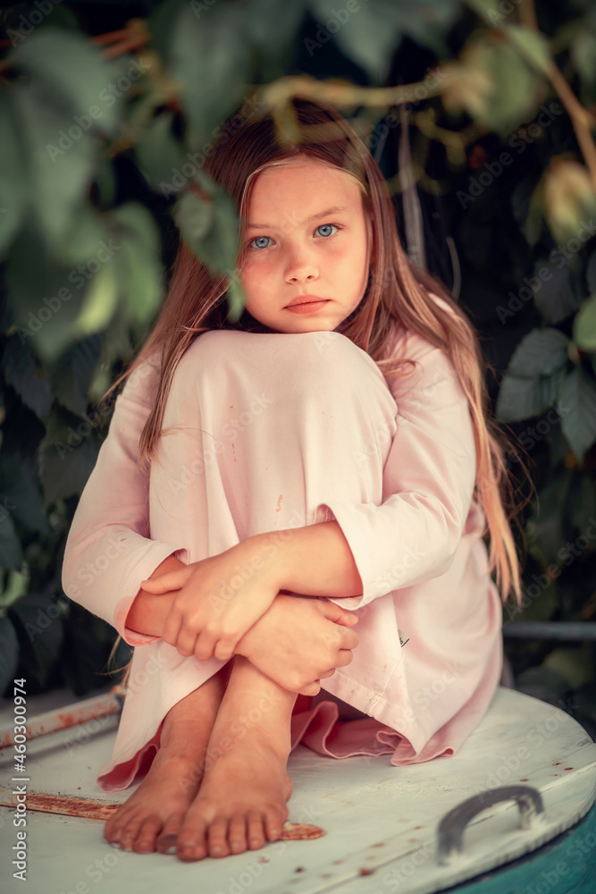 Beautiful young girl is dreaming sitting on the well covered with ivy. Image with selective focus and toning