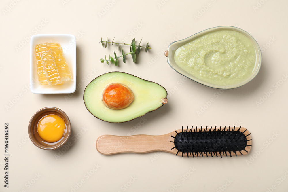 Homemade hair mask in bowl, fresh ingredients and wooden brush on beige background, flat lay