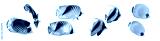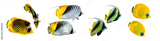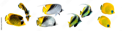 Different types of Butterflyfish (Raccoon, Masked, Threadfin Butterflyfish, Pennant Coralfish) isolated on white background. Set of striped tropical fish, side view, cut out. Underwater diversity.