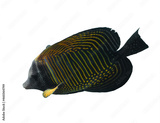 Red Sea sailfin tang (Zebrasoma desjardinii) isolated on a white background. Marine black tropical fish with yellow stripes, Red Sea, Egypt. Underwater photo, side view, close up, cut out.