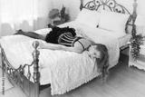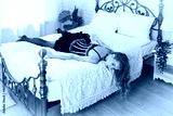 Strangled beautiful woman in a bedroom. Simulation of the crime scene.............