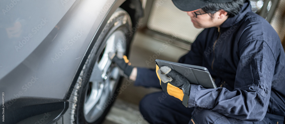 Asian auto mechanic holding digital tablet checking car wheel and tire in auto service garage. Mechanical maintenance engineer working in automotive industry. Automobile servicing and repair concept