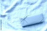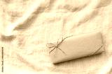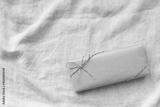 俯瞰からのみどりの紐のプレゼントとグレーの布背景