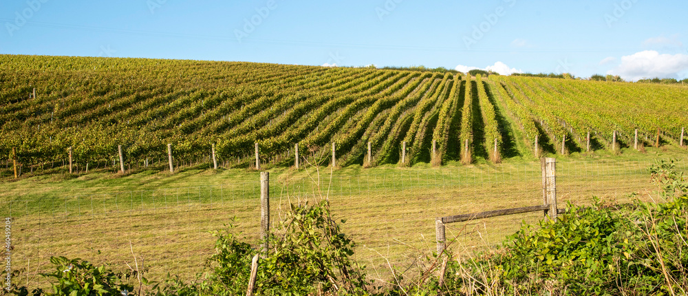 Hampshire, England, UK. 2021. Vines growing on a south facing hillside in Hampshire, southern England, UK