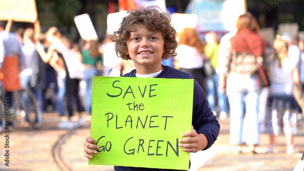 Italia, Milano , Activist boy Child 7 years old with sign Save the Planet , go green - Friday for Future Youth 4 Climate - student demonstration against climate change and global warming
