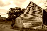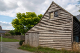 Guiting Power, Gloucestershire, England, UK. 2021. An old wooden barn with small garage doors in the rural Cotswolds village of Guiting Power.