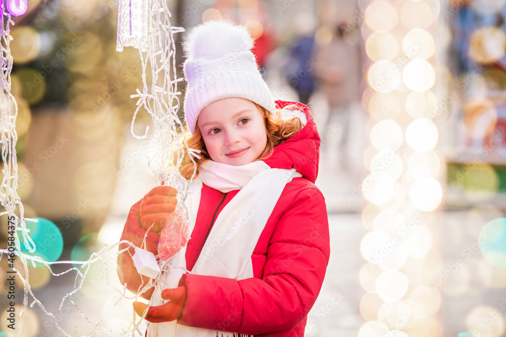 A child red-haired girl walk and look at the stall with garlands at the festively decorated Christmas market in the city.