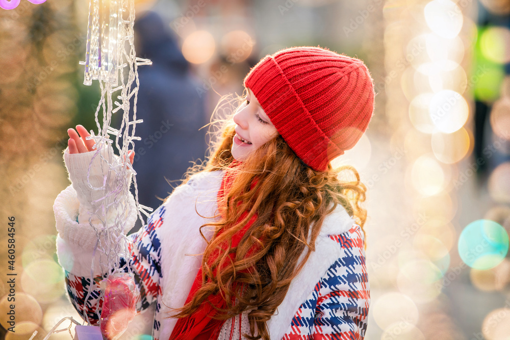 A child red-haired girl walk and look at the stall with garlands at the festively decorated Christmas market in the city.