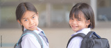 Portrait of children student in uniform and backpack Looking at camera going back to school after covid-19 quarantine and lockdown. Back to School Concept Stock Photo