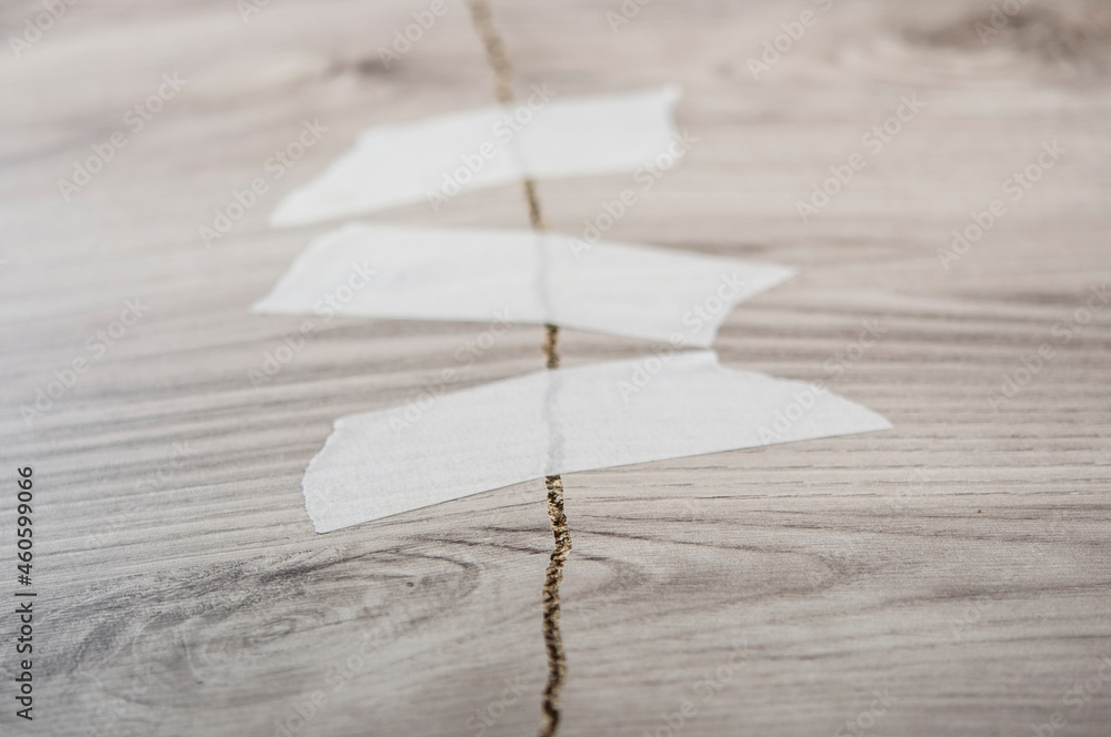 grey background of broken plywood board with texture sealed with tape