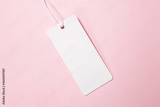 white tags, sale tag on pink background. Mockup, copy space for text, top view
