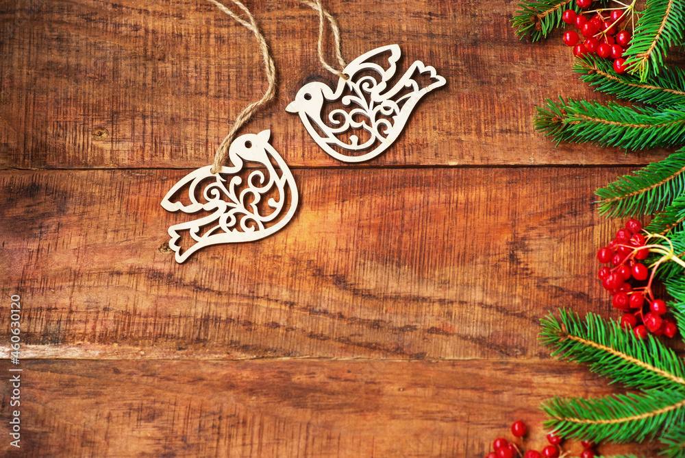 Christmas background. Spruce branches, red berries of potassium and wooden figures of birds on a wooden background