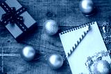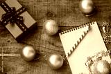 Christmas background. Pink Christmas balls, notebook, gift and golden garland on a wooden background.