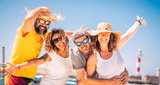 Group of happy people and cheerful adults friends having fun together during summer vacation. Portrait of two caucasian couples posing on holiday tour. Enthusiastic friends posing on vacation