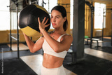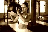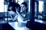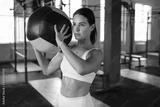 Fit and muscular woman exercising with medicine ball at gym.