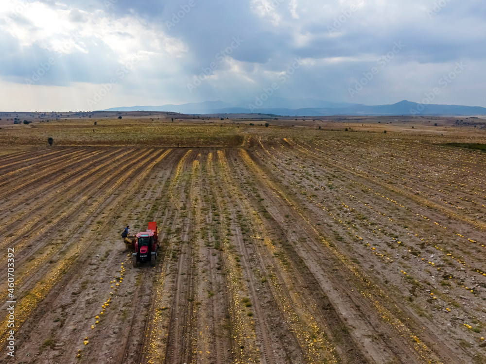 Top view of pumpkin harvest with red tractor. Orange colors autumn concept