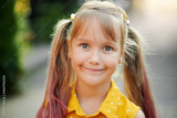 Toothless childrens smile. Little cute girl child laughs, shows the fallen out first milk tooth. Children's dentistry
