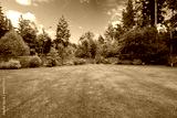 Green large fenced backyard with trees.
