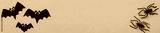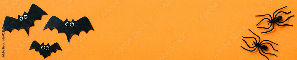 Halloween panoramic banner with funny bats and black spiders, flat lay, concept of header, orange background.